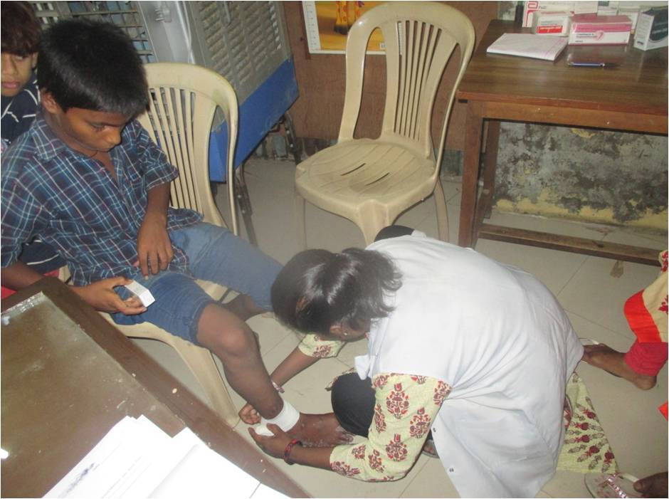 Since, he had been living in an environment prone to diseases with a much higher risk than normal, he had got some blisters on one of his legs, possibly due to the moist rainy season, which worsened as one day, while he was getting down the train, he got hurt on that same leg and his condition worsened, leaving him in deep pain. Some of his friends i.e. the other street kids helped him to reach the Don Bosco Health Centre. At the Centre he met Dr. Sachin and Nurse Sr. Mary and explained to them everything about his condition. Under Dr. Sachin’s guidance and expertise, Nurse Sr. Mary provided Rahul with the best possible first-aid and thereafter, guided him as how to take the medicines and take care of the wound. He definitely was instantly relieved and smiling with a sigh of relief.